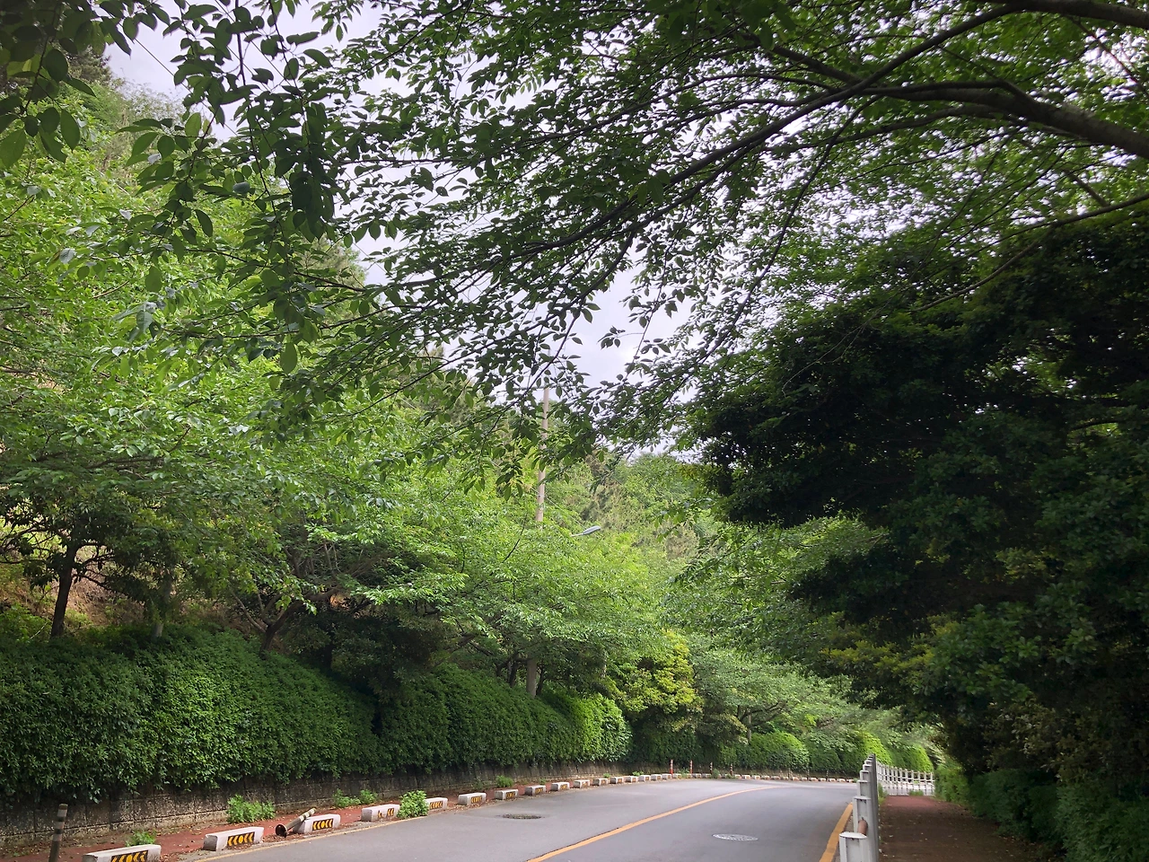 조금 더 가면 왼편으로 수치마을로 들어가게 되는 두 갈래 길이 나온다. 이곳에서 조선소 담장을 돌아 나오던 길은 끝이 난다. K조선 기술훈련원이 있는 오른쪽 길로 접어들어 산길도로가 이어진다. (14:24, 6.9km) 산길도로의 좌우로 커다란 벚나무들이 이어진다. 그렇지, 여기는 진해이니 벚나무가 길가에 늘어선 것이 당연한 풍경이지. 벚나무 가지들이 바람에 흔들리면서 진하게 푸르른 이파리들이 품어내는 향긋한 내음들 때문에 갑자기 기분이 좋아진다. 벚꽃이 필 때쯤이면 굉장히 보기 좋은 풍경을 연출하는 길이 아닐까 상상해 본다.