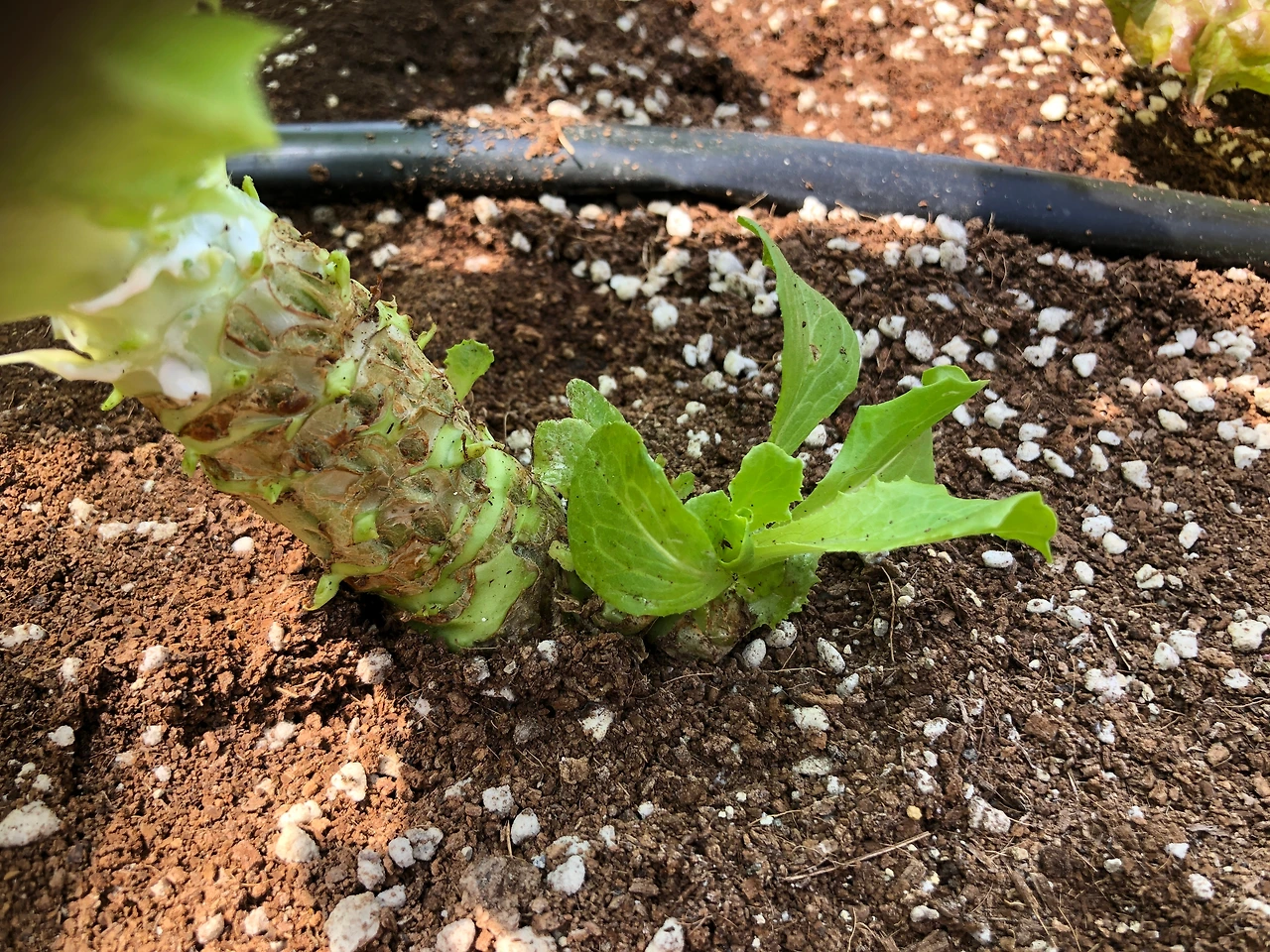 상추잎을 딸 때에는 너덜너덜하게 잔이파리를 남겨두지 않는다. 잔이파리를 남겨두지 않는 요령이 있다. 상추잎은 뜯어내듯이 따내면 안 된다. 상추잎을 딸 때에 줄기에 붙은 부분을 바짝 붙여 잡고 살짝 아래로 눌러 준 후에 옆으로 돌려서 따면 깔끔하게 따낼 수 있다. 유튜브에서 언젠가 들은 내용이지만, 잔이파리를 남겨 두면 수확을 하지 않은 것으로 인식을 한다고 한다. 공감이 가는 내용이다. 잔이파리가 너덜너덜하게 남아 있으면 그 사이로 곁줄기가 새로 나오는 현상도 생길 수 있다. 보기에도 좋지 않다. 게다가 꽃대가 일찍 올라오는 것을 막는 데에도 방해가 될 수 있다. 올 초에 흙 속에서 올라온 벌레가 어린 상추모종을 먹은 적이 있었다. 인체에 해가 없는 미생물 성분의 친환경 토양살충제를 조금 더 뿌려주고 나서 그 문제는 해결했다. 하지만 그로 인한 부작용으로 벌레가 먹다만 상추모종이 자라면서 옆으로 곁줄기들이 생기는 모습을 보면서도 확인하게 되었다. 곁줄기가 생기거나 두 개의 상추가 붙어서 자라면 이파리가 작고 촘촘하게 자라서 아삭한 상태의 맛있는 상추로 자라지를 못한다.