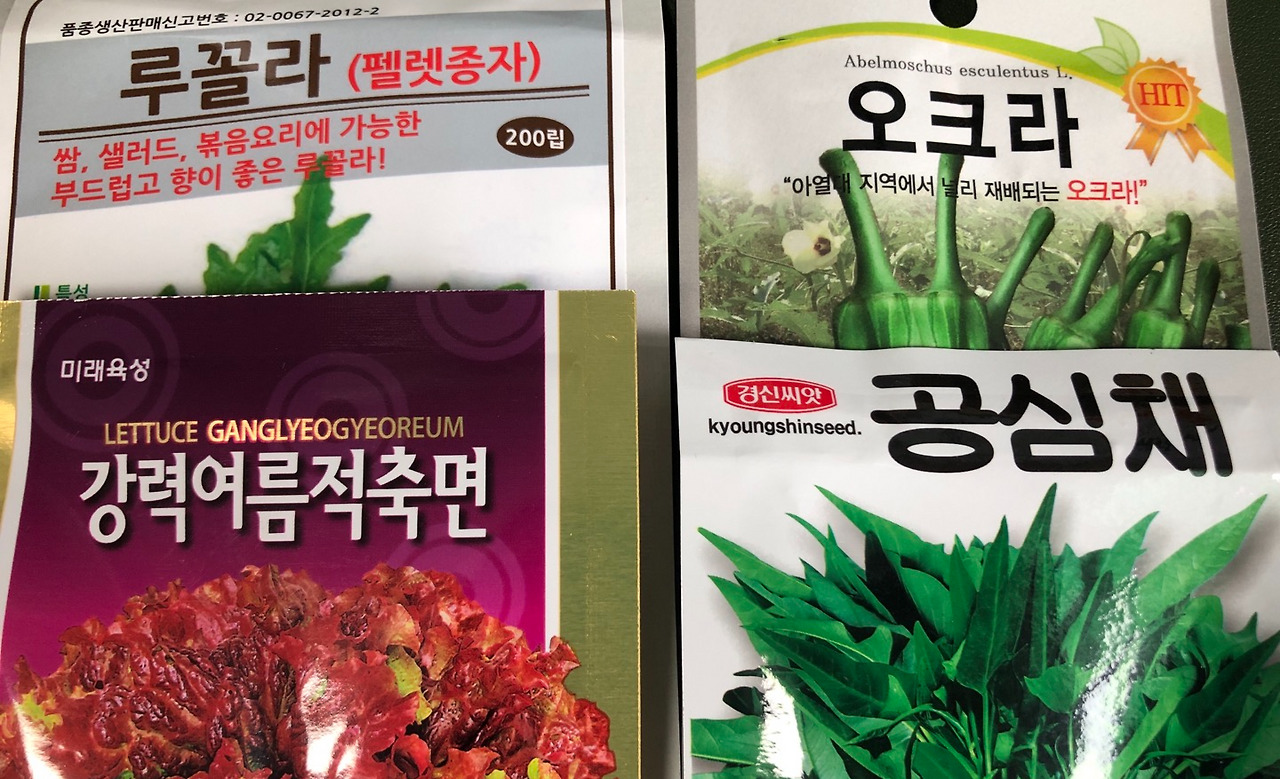 오크라, 공심채는 먹어보지도 않은 것이지만 매력이 있어 키워보기로 했다. 루꼴라는 밀식 탓에 맛만 보고 꽃이 피어 버려서 입만 버렸다. 그래서 다시 도전...
