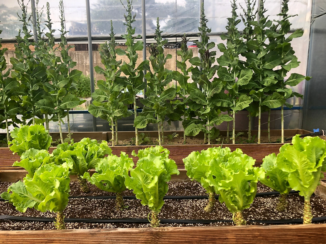 우선, 앞서 이야기한 바와 같이 첫 파종을 했던 흑하랑은 성장이 엄청 빨라서 키가 쑥 자랐다. 꽃대도 거의 다 나왔다. 흑하랑을 파종하던 시기와 비슷하게 모종으로 심었던 로메인상추의 키와 비교한다면 엄청난 차이를 보인다. 물론 로메인상추는 아직도 왕성하게, 알차게 수확을 하고 있다. 흑하랑은 지금 보이는 이파리들이 마지막 수확이 될 것이다. 그러니 대략 세 차례 정도 수확을 한 것 같은데, 벌써 마지막을 보이고 있다.