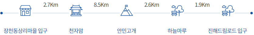 상리마을 버스정류장 - 정자 쉼터(2.0km) - 천자암 입구(3.0km) - 해병훈련테마쉼터(4.9km) - 2층 정자 쉼터(6.3km) - 청룡사 입구(7.0km) - 안민고개/풍경 카페(11.3km) - 장복산 누리길 편백숲 쉼터(12.6km) - 하늘마루 전망대(14.6km) - 삼밀사 입구(16.1km) - 진해드림로드 입구(16.7km)