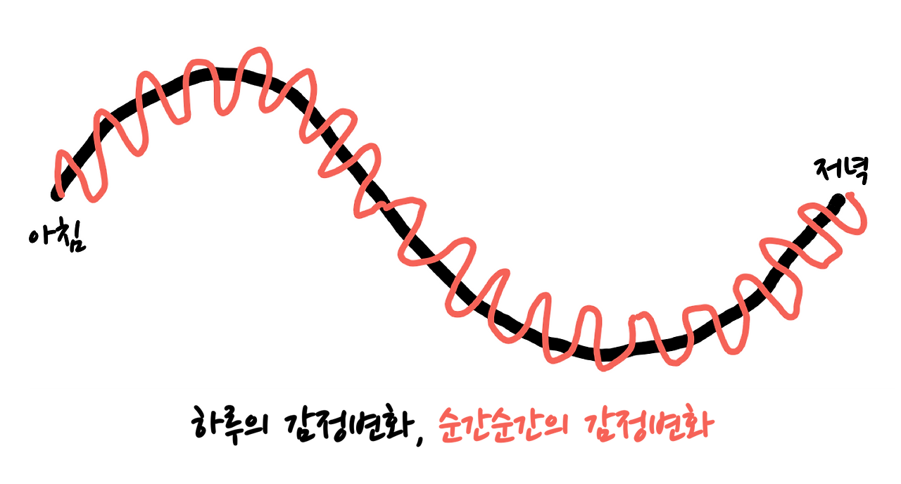 아침에 출근해서 문제를 일으킨 직원을 혼낸다. 그 직후에 번아웃에 빠져있는 다른 직원을 독려하고 달랜다. 또 최근 좋은 성과를 낸 팀을 전체 앞에서 칭찬하고 보상한다. 그런데 갑자기 외부 고객사에서 몇 달 동안 공들인 계약 건을 드롭하겠다고 해서 절망에 빠진다. 이때 팀장 하나가 면담 요청과 함께 연봉을 올려달라고 해서 어렵게 설득을 끝내자마자, 다른 고객사에서 어제 발표한 제안을 계약하겠다고 연락이 와서 기뻐한다. 숨 좀 돌리려 하는데 어떤 직원이 거짓말한 것을 알아채고 화가 머리 끝까지 난다. 그런데 갑자기 최근 친해진 파트너사의 담당자가 커피 한잔 하자고 한다. 향후 큰 계약 건을 빌미로 무상 협찬을 요구하는데 참 난감하다. 이때 퇴사 면담을 요청하는 직원의 메일을 받는다. 조직에 대한 실망과 나에 대한 실망을 동일시하는 것 같아서 마음이 불편하다. 그렇게 퇴근시간이 지나서 사무실에 다시 들어가니 친한 직원 하나가 대표님은 너무 바쁘시고 요즘 표정이 너무 어둡다고 한다. 이 모든 것이 하루 동안 일어나는 일이다. 나의 오늘 기분은 뒤죽박죽이다. 마치 이 그래프와 같다.
