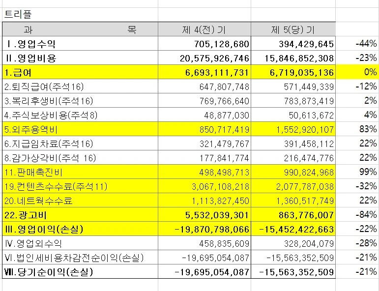 막을 수 없는 위기가 찾아와도 한 번에 피할 수는 없습니다. 이유는 바로 고정비인데요. 대표적인 고정비는 바로 인건비입니다. 노동법과 각종 규제 그리고 노조 등의 영향으로 인건비는 감축이 상당히 어려운 비용입니다. 트리플은 150억의 손실을 기록했지만 67억의 인건비를 거의 줄이지 못했습니다.