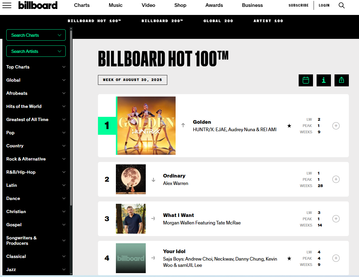세계의 반응은 놀라웠다. 주제곡 《Golden》은 빌보드 핫100에서 1위에 올랐고, 케이팝 여성 가수 곡으로는 최초로 미국과 영국 차트를 동시에 석권했다. 영화 사운드트랙은 빌보드 200에서 2위를 기록했고, 무려 8곡이 핫100 차트에 동시 진입하는 전무후무한 기록을 세웠다.