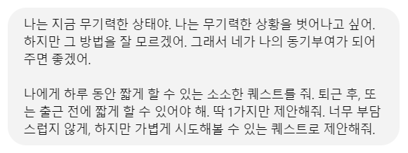 "나는 지금 무기력한 상태야. 나는 무기력한 상황을 벗어나고 싶어. 하지만 그 방법을 잘 모르겠어. 그래서 네가 나의 동기부여가 되어주면 좋겠어. 나에게 하루 동안 짧게 할 수 있는 소소한 퀘스트를 줘. 퇴근 후, 또는 출근 전에 짧게 할 수 있어야 해. 딱 1가지만 제안해 줘. 너무 부담스럽지 않게, 하지만 가볍게 시도해 볼 수 있는 퀘스트로 제안해 줘."