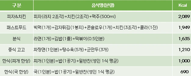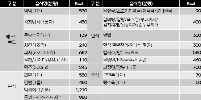 그럼 소중한 한 끼에 무엇을 먹어야 할까요? 피자, 치킨, 햄버거 세트의 한 끼는 대략 2,000kcal입니다. 분식, 중식은 약 1,500kcal, 한식 찌개 한상은 1,000kcal, 한식 국 한상은 700kcal로 계산하시면 됩니다.