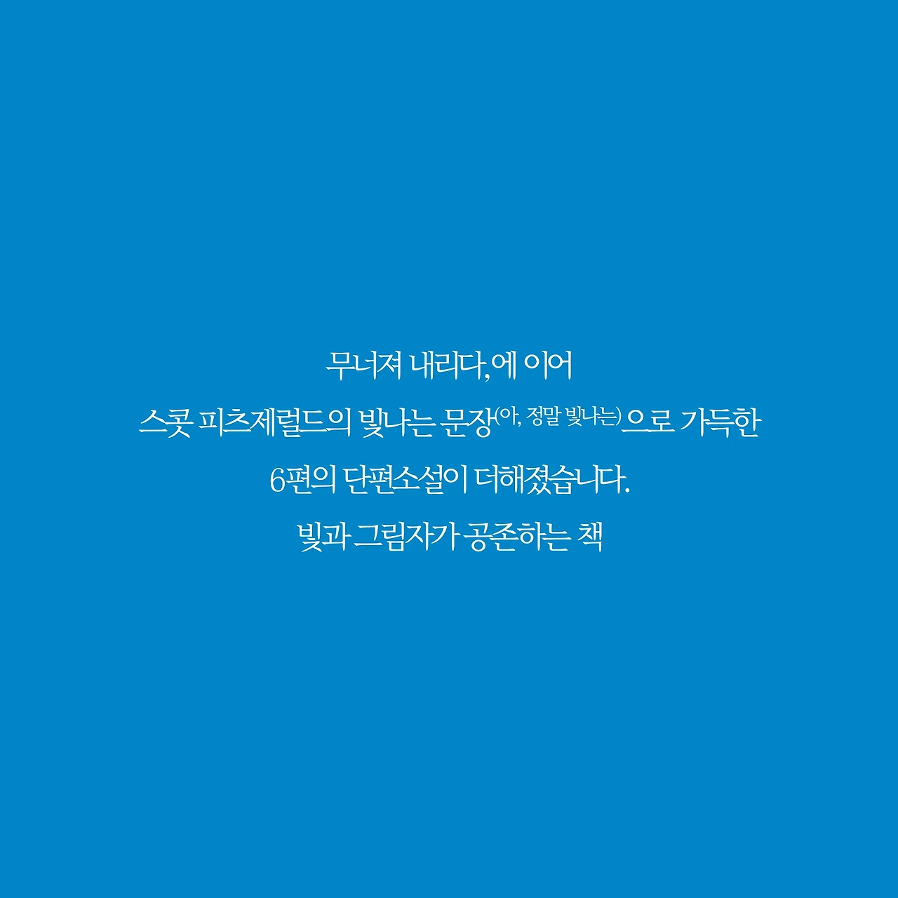 이 책은 1936년 에스콰이어 지에 연재했던 자전적 에세이 <무너져 내리다The Crack-Up>를 표제작으로 6편의 단편소설을 더해서 하나로 묶은 작품집입니다. 피츠제럴드의 지적인 면모와 탁월한 문체를 영어가 아닌 우리말로도 마음껏 느낄 수 있는 보기 드문 번역이지요. 글쓰기를 좋아하는 독자께서 이 피츠제럴드 단편선을 본받아 문장연습을 하신다면 틀림없이 큰 도움을 얻으리라 생각합니다. 글쓰기에 필요한 모든 게 들어 있기 때문입니다.