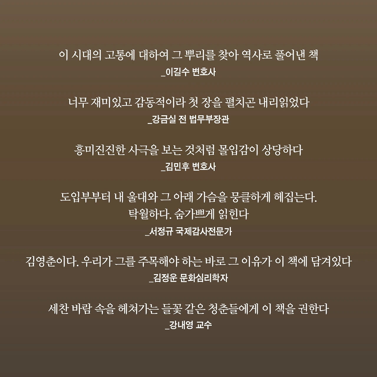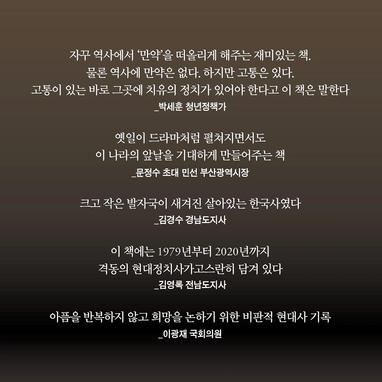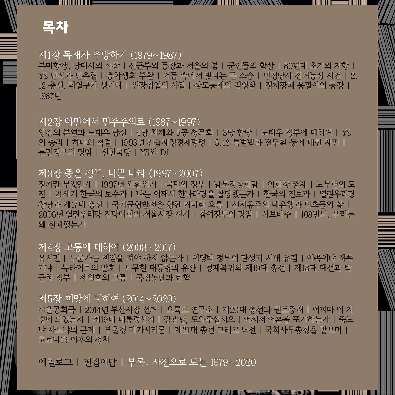 이 책은 한국 당대사에 관한 기록이에요. 이 기록은 1979년 유신정권이 무너지는 계기로 작용한 부마항쟁에서 시작합니다. 그리고 오늘에 이르게 되고요. 41년의 세월 동안 전두환, 노태우, 김영삼, 김대중, 노무현, 이명박, 박근혜, 문재인 대통령까지 여덟 명의 대통령이 각자의 색채와 스타일로 등장하는 드라마이기도 합니다.