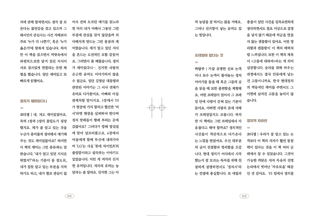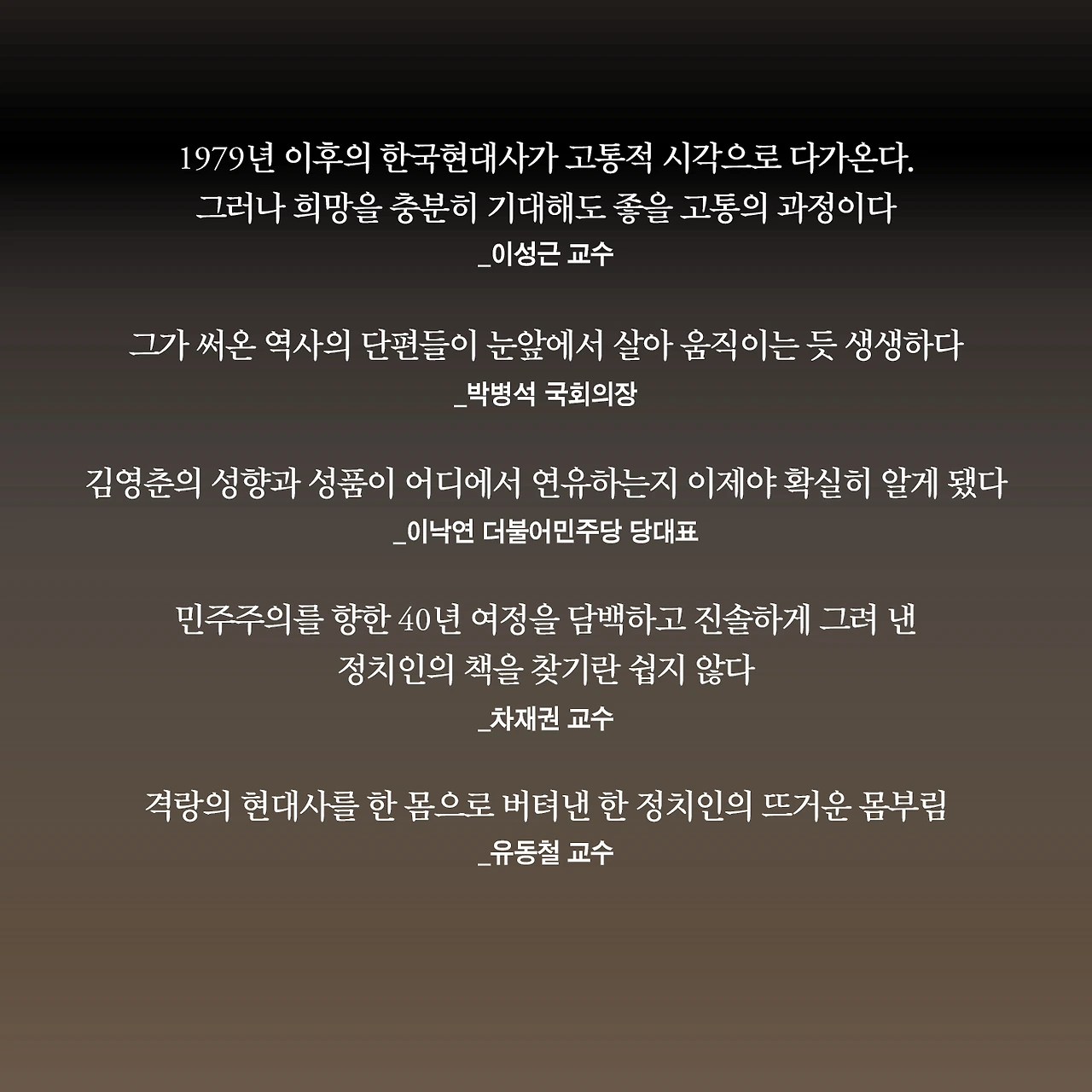 1980년부터 지금까지 누군가 이 다이내믹한 한국정치를 좀 명쾌하게 정리해줄 사람, 믿을 만한 사람 없을까? 평론가와 교수는 아니야. 그런 분들은 내막과 구체적인 사정을 모르니까. 막전막후의 이야기까지 포함해서 그런 걸 누구보다 잘 알면서도, 아, 이 사람 이야기라면 한번 들어볼 만해, 라는 자격을 갖춘 사람은 누구일까?