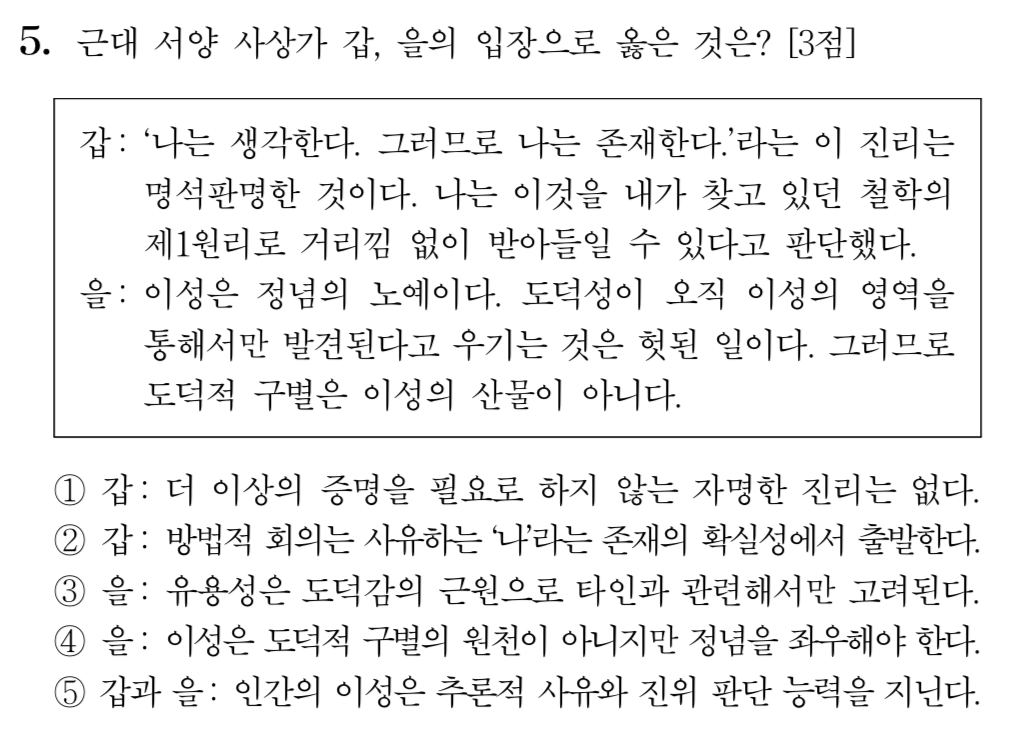 결국 ⑤번이 정답이 되겠는데.... 인간의 이성은 추론적 사유와 진위 판단 능력을 지닌다. 이것은 이성(Reason)의 사전적 정의를 풀어쓴 것이다. 추론적 사유를 영어로 Reasoning이라고 한다. 무엇인가가 진짜인지 거짓인지 판단하는 능력은, 어떤 시금석을 갖고 비교해서 결론을 추론하는 행위, 즉, 그게 바로 이성의 능력이다. 어떤 철학자도 ⑤번을 부정하기 어렵다.
