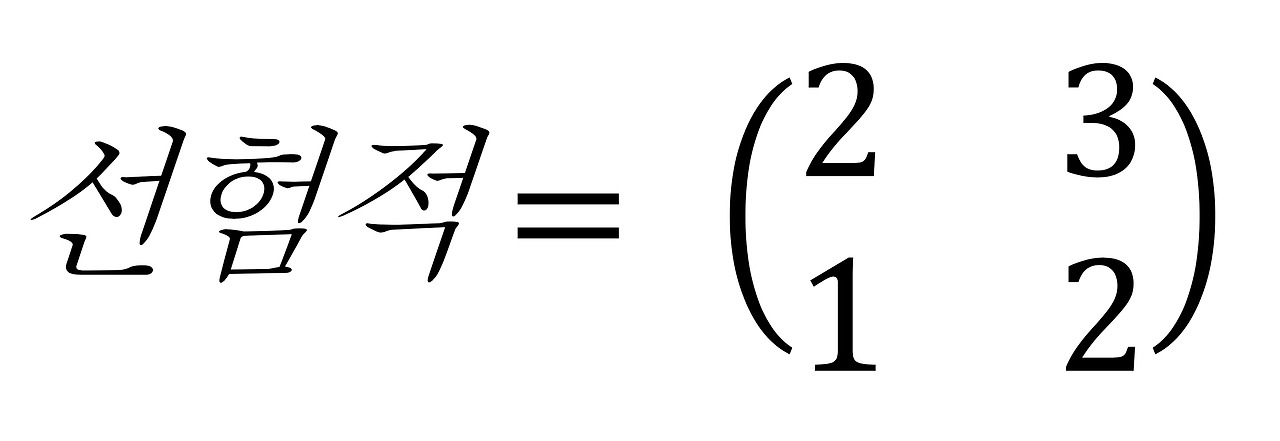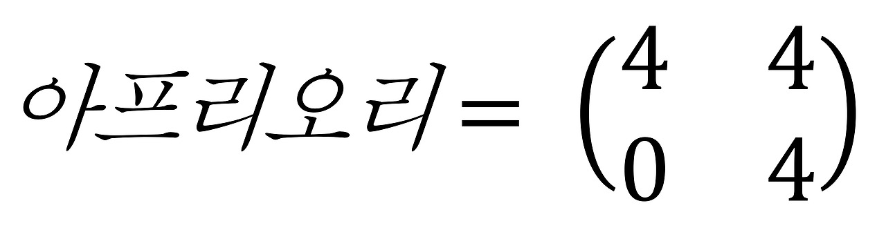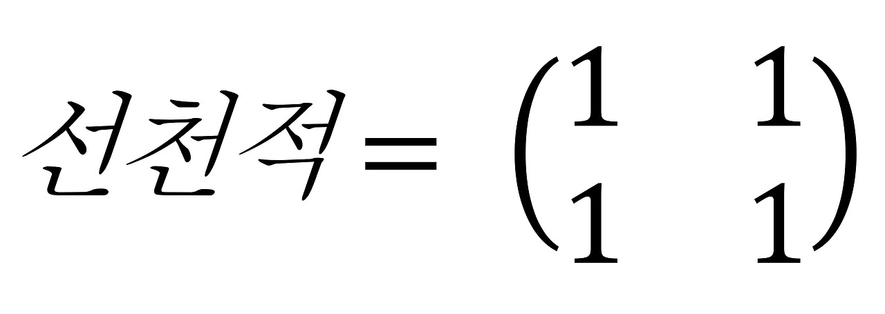 행렬의 각 성분 값이 1에 그친다. 따라서 ‘선천적’이라는 단어는 a priori의 한국어 번역어로 큰 문제가 없다. 괜찮은 번역이다. 반면 ‘선험적’은 일상 생활에서 사용되지 않는 단어이다. 마치 일본인처럼 학자들이 자신들의 필요에 의해 한자를 조합해서 만들어 낸 조어이다. 이 단어의 위상값은 다음과 같다.