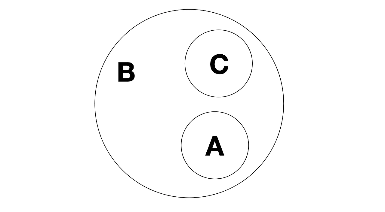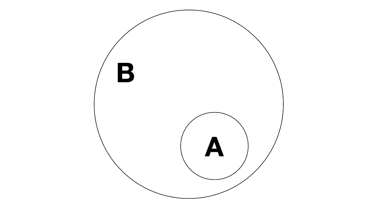 여기 두 개의 집합이 있다. 집합 A는 집합 B에 속해 있고, 그러므로 집합 B의 부분집합이다. 부분집합의 논리 관계로 사례를 풀어 본다.