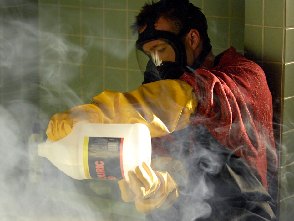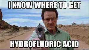 브레이킹 배드(Braking Bad)라는 미국 TV 드라마 시리즈(2008~2013)가 있습니다. 주인공 월터 화이트가 맹독 액체로 시체를 녹이는 장면이 나옵니다. 그때의 액체가 불산입니다. 플루오린화 수소산(Hydrofluoric acid)이라고 부르지요. 불화수소(HF: Hydrogen Fluoride)를 물에 녹인 수용액입니다. 물론 드라마 장면은 과학적으로 매우 과장된 얘기여서 그 정도까지 무엇이든 녹이지는 않습니다.