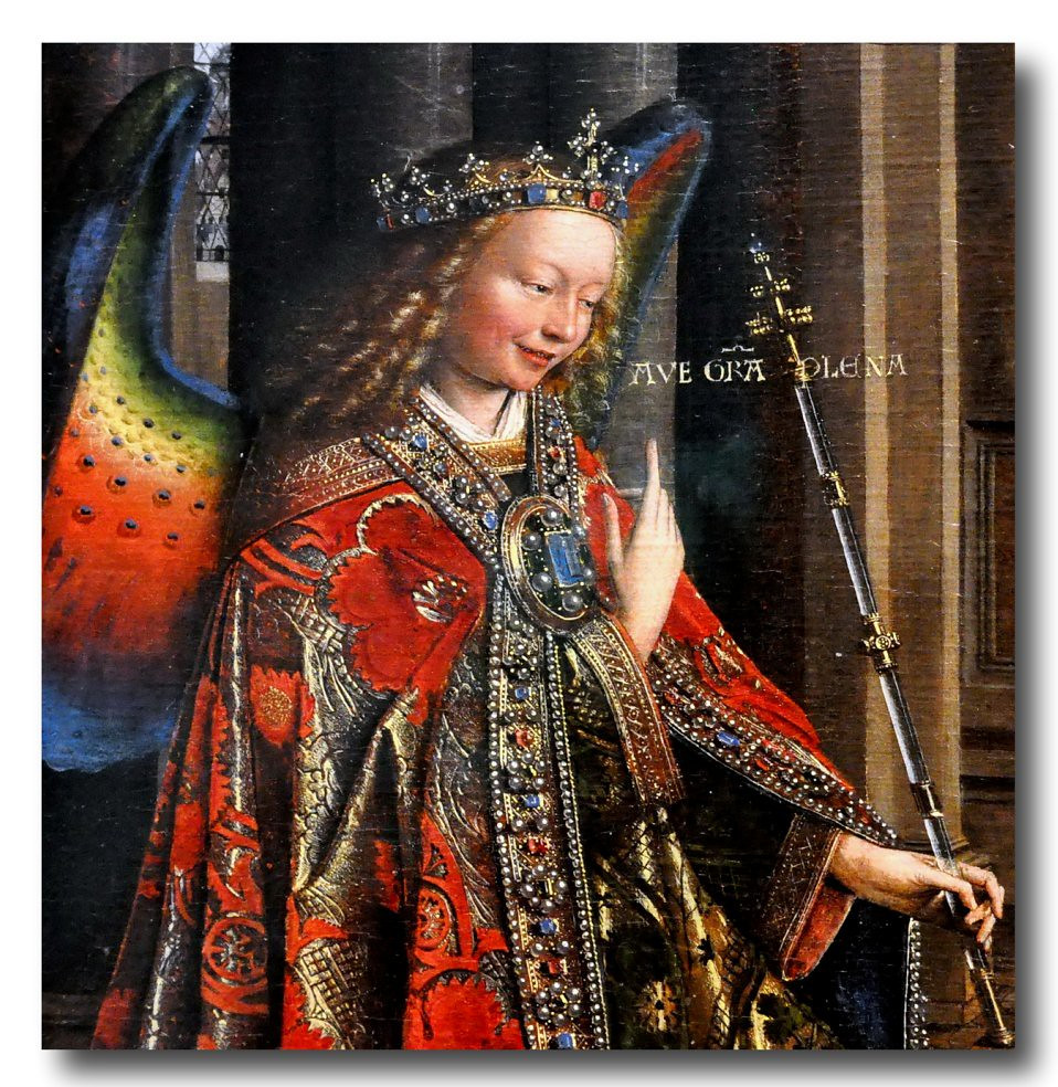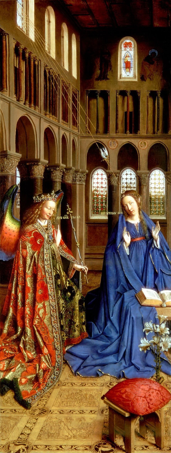 르네상스 시절인 15~16세기에 특히 많이 그려졌습니다. 몇몇 수태고지 그림을 여기 소개합니다. 가장 유명한 그림으로는 얀 반 에이크(Jan van Eyck, 1390-1441)의 수태고지입니다. 1434년 그림입니다. 가브리엘 천사가 말합니다.