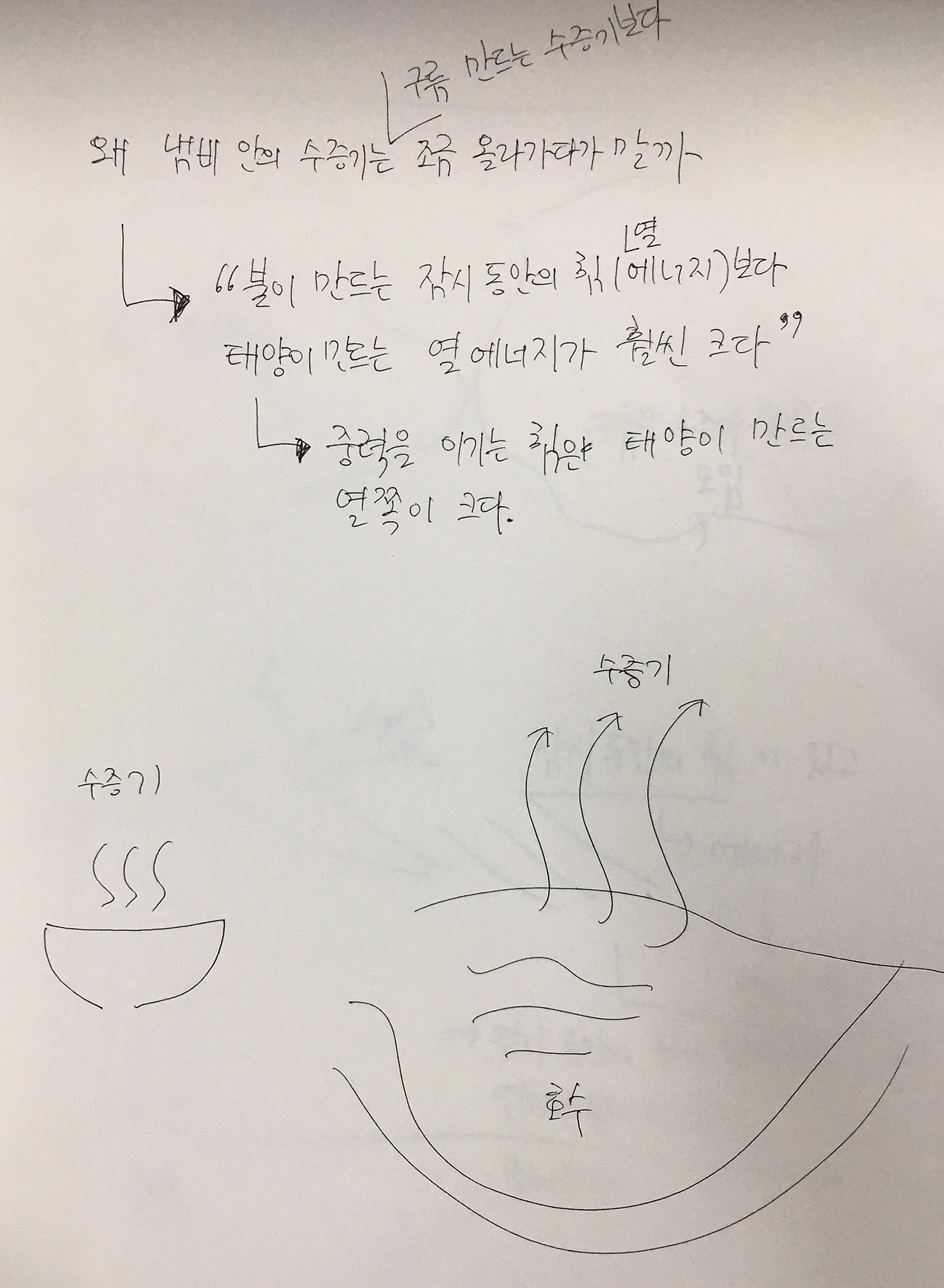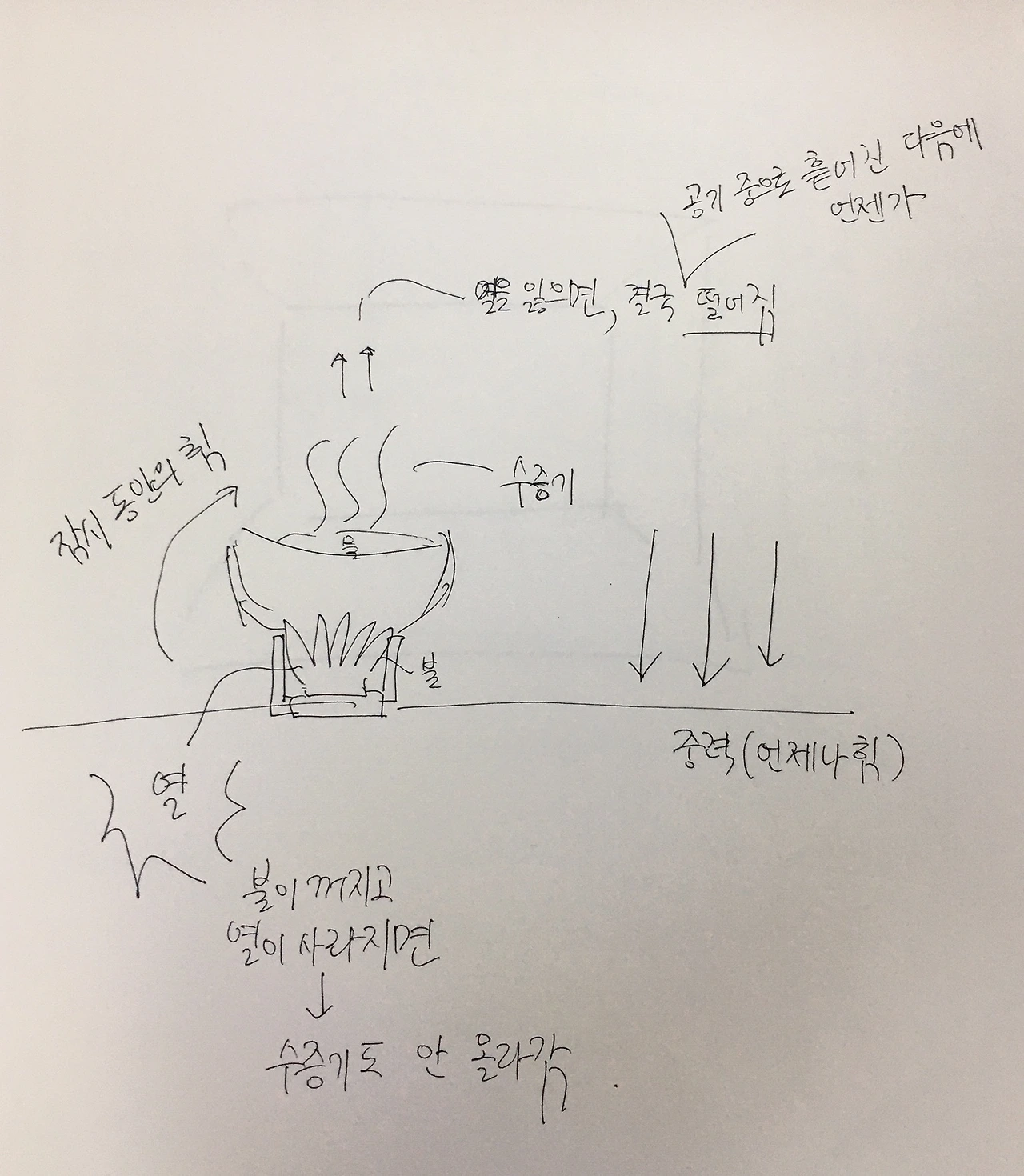 응? 왜 냄비 안의 수증기는 구름을 만드는 수증기보다 조금 올라가다가 마냐고? 그건 잠시 동안의 힘이 다르니까. 불이 만드는 잠시 동안의 힘(열 에너지라고 해)보다 태양이 만드는 열 에너지가 훨씬 크니까. 중력을 이기는 힘도 태양이 만드는 열 쪽이 크지 않겠어?