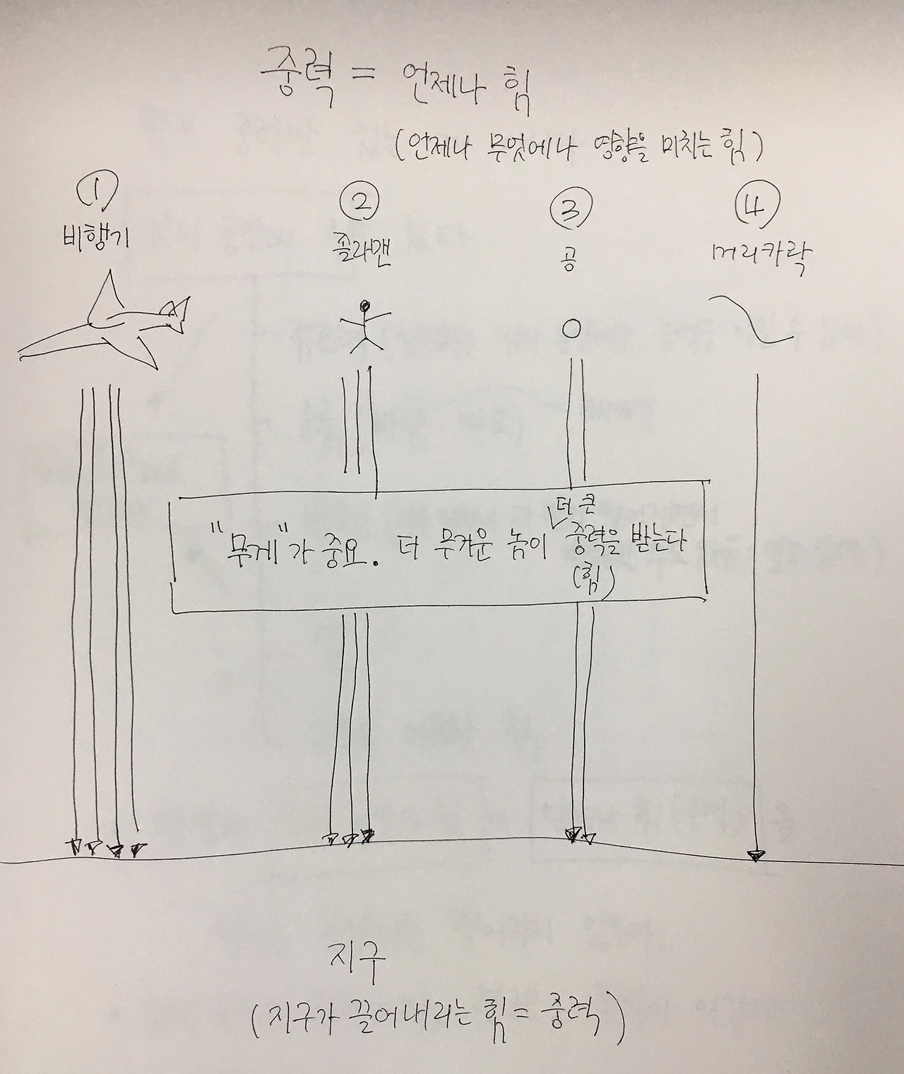 언제나 무엇에나 영향을 미치는 힘을 <언제나 힘>이라고 해. 아빠가 만든 말이야. 뭐라고? 그래 "언제나 힘". 중력은 언제나 힘이야. 언제 어디에서나 중력이 있는 거야. 아래에 지구가 있어. 그리고 아빠는 네 가지 물체를 준비했지. 1번 비행기. 2번 졸라맨, 3번 공. 4번 머리카락. 이들 네 개의 물건을 지구는 끌어내리고 있어. 모두에게 중력이 있는 것인데, 중력은 무게가 중요해(f=mg를 설명할 수 없으므로). 더 무거운 놈이 더 큰 중력을 받는 거야. 4번 머리카락은 매우 가볍지만 1번 비행기는 매우 무겁거든. 그러니까 비행기가 받는 중력이 머리카락보다 훨씬 커.