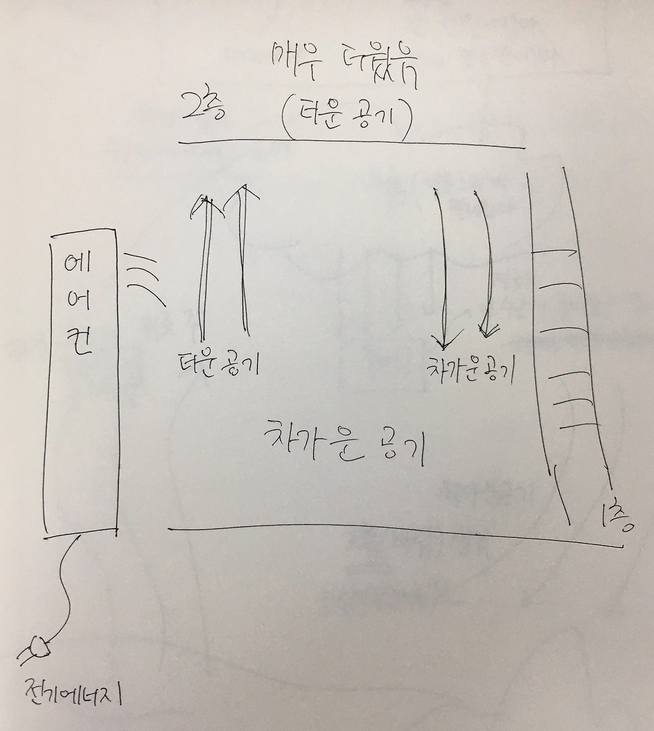 아, 그런데 더운 여름날 생각해 보면, 에어컨을 틀어놓고 2층 다락방으로 올라가면 어땠니? 그래 미친 듯이 더웠지. 그건 왜 그럴까? 차가운 공기는 아래쪽에 있기를 좋아하고, 더운 공기는 위로 올라가기 때문이야. 온도와 공기는 그런 관계야. 나중에 이게 (더운 공기와 차가운 공기 둘 중 어느 것이 위로 올라가는지) 되게 헷갈릴 거야. 그럴 때마다 기억해. "여름 2층은 정말 더웠다"