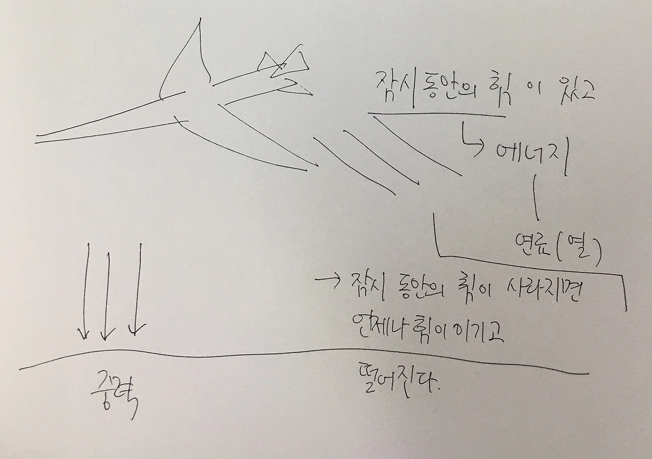 그래, 비행기가 연료를 써서 잠시 동안의 힘이 생기는 동안에는, 그 에너지 때문에 날 수는 있어. 하지만 잠시 동안의 힘이 사라지면 언제나 힘이 이기고, 결국 떨어지지.