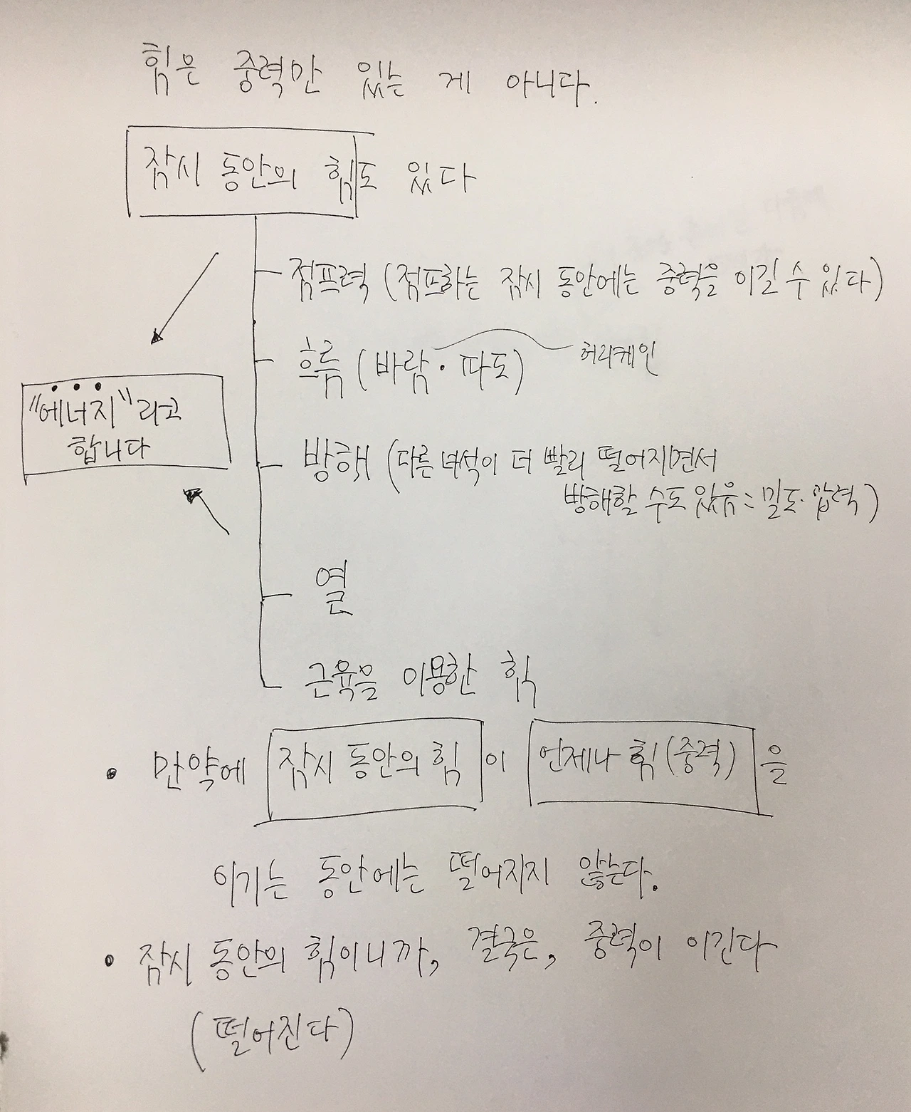 만약에 <잠시 동안의 힘>이 <언제나 힘(중력)>을 이겨낼 수 있다면, 그 잠시 동안에는 떨어지지 않아. 잠시 동안의 힘이니까, 결국은, 중력이 이겨. 떨어지지. 그 잠시 동안의 힘을 우리는 "에너지"라고 부르기로 약속했어. 잠시 동안의 힘을 유지하려면 에너지가 필요하다는 것인데, 에너지를 쓰지 않고 중력의 법칙을 이길 수는 없다는 이야기야. 큰 에너지는 있어도 영원한 에너지는 없어.