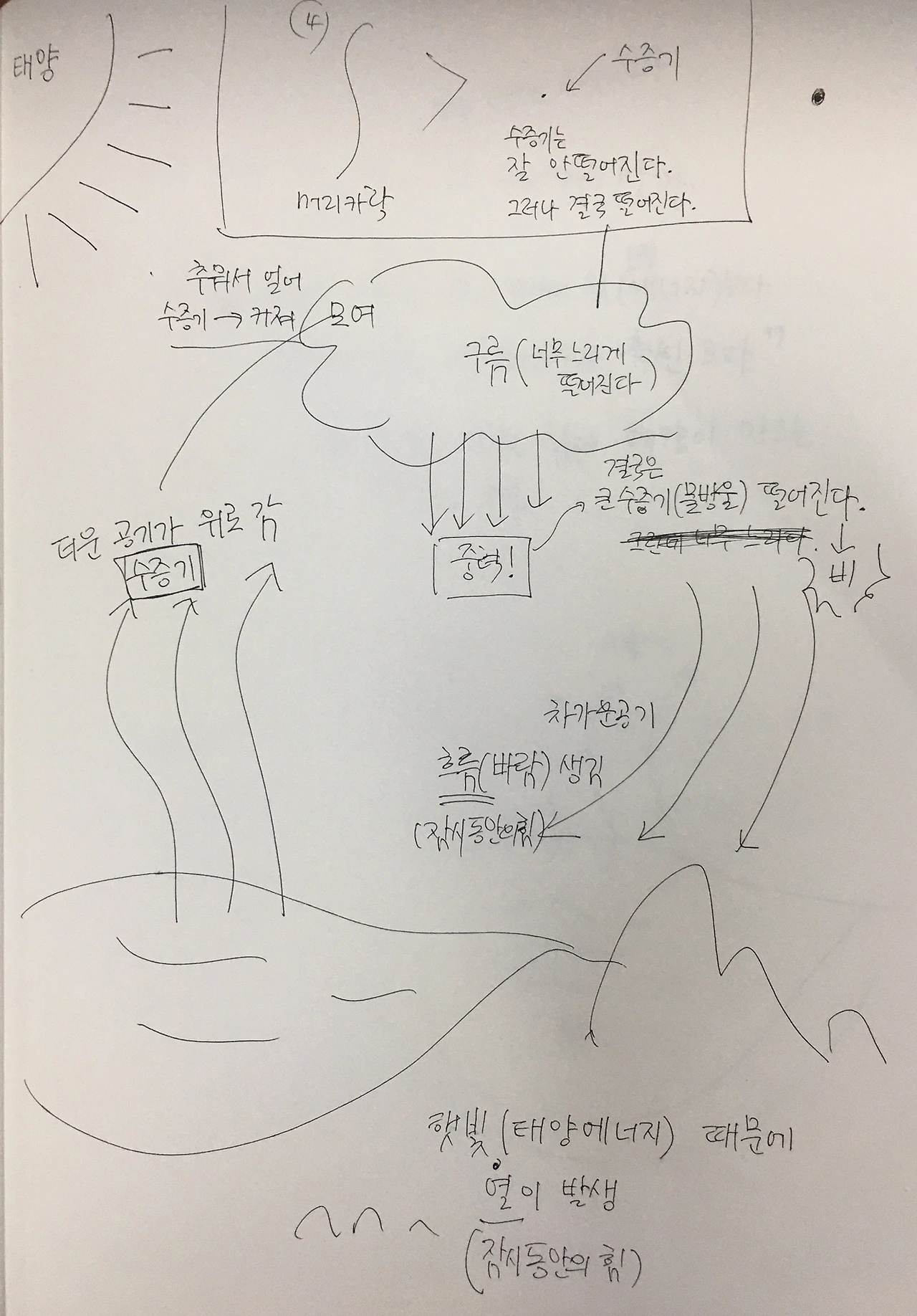 태양은 멀리 떨어져 있지만 언제나 뜨거운 열을 지구로 보내지. 태양 때문에 열을 받아서 강가나 호수나 바다나 따뜻해지면 수증기가 생겨. 수증기가 주위 공기를 덥히면서 위로 올라가. 그러면 차가운 공기는 아래로 내려오지. 그래서 흐름이 생겨. 그런데 수증기가 무작정 올라가는 건 아니야. 중력의 법칙이 있으니까. 대충 올라가다가 갑자기 추워지겠지. 높은 곳은 춥잖아. 그래서 수증기들이 모여. 커져. 그래서 구름이 돼. 구름에도 언제나 힘(중력)이 있어서 밑으로 떨어지는데 그게 너무 느려서 보이지 않을 뿐이야. 머리카락보다 수증기가 더 작거든. 그래서 수증기는 잘 안 떨어지는 거야. 그렇지만 결국은 떨어져. 수증기가 얼어서 얼음이 되거나 덩어리가 되면 그게 비가 되든 눈이 되든 어쨌든 팍팍 떨어지게 돼.