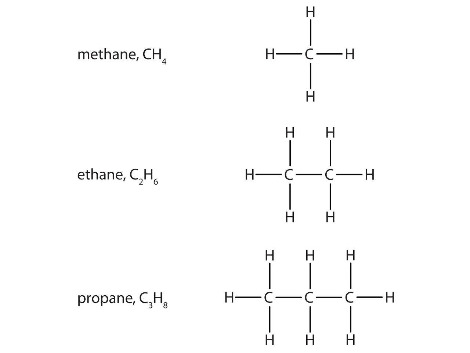 탄소가 모든 물질의 제왕이 될 수 있던 것은 수백만 개가 넘는 탄소화합물을 만들기 때문입니다. 일단 생명이 있는 모든 존재는 아주 다양한 탄소화합물을 갖고 있습니다. 학교에서 배우는 몇 가지 탄소화합물을 다시 살펴보지요. 가장 간단한 탄소와 수소의 화합물입니다. 탄소의 개수에 따라 메탄, 에탄, 프로판, 부탄, 펜탄, 헥산, 헵탄, 옥탄, 노난, 데칸이라고 명명합니다. 간단한 연결이지요. 여기에 탄소끼리 이중결합을 한다거나 수소가 아닌 다른 원소가 붙는다거나 하면서 매우 많은 탄소화합물을 만들어낼 수 있습니다.