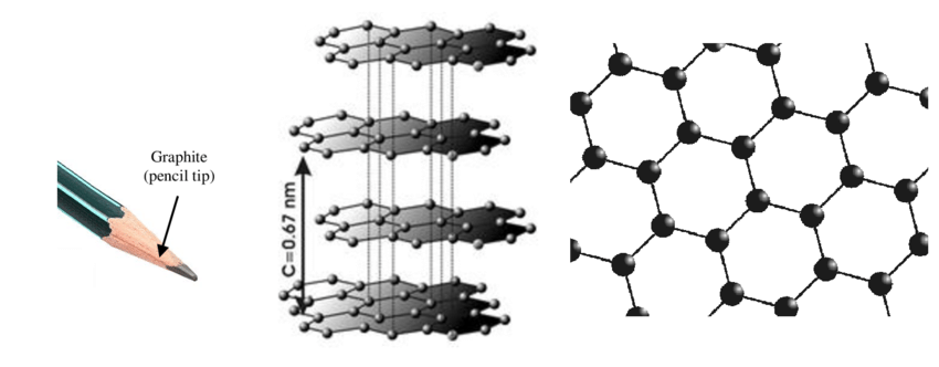 물리적인 구조는 아래와 같습니다. 전기를 아주 잘 통합니다. 흑연은 한반도에 많습니다. 특히 북한은 세계 4위 수준의 매장량입니다. 다이아몬드가 아닌 흑연이 한반도에 많은 건 다행입니다. 다이아몬드였다면 괜히 내전과 침략이 일어날 테니까요. 흑연은 아래 그림처럼 6각형 탄소격자가 층층이 쌓이는 구조입니다.