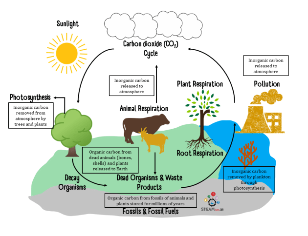 이산화탄소는 순환됩니다. 대기 중에는 이산화탄소가 있습니다. 광합성에 의해 상당수의 이산화탄소를 식물이 흡수합니다. 동물과 식물 호흡으로 이산화탄소가 배출되지요. 바다는 매우 많은 이산화탄소를 흡수하지요. 식물성 플랑크톤이 광합성을 하면서 상당량의 이산화탄소를 먹습니다. 나무든 동식물이든, 육지생명이든 바다생명이든 죽은 다음에는 적합한 조건에서 오랜 시간이 흐른 후 화석연료(Fossil fuel)가 됩니다. 그게 석유, 천연가스, 셰일가스, 석탄이 됩니다. 화석연료를 사용하면 이산화탄소가 배출됩니다. 귀소본능 같은 것이지요. 처음 시작한 곳으로 되돌아가는 것입니다.