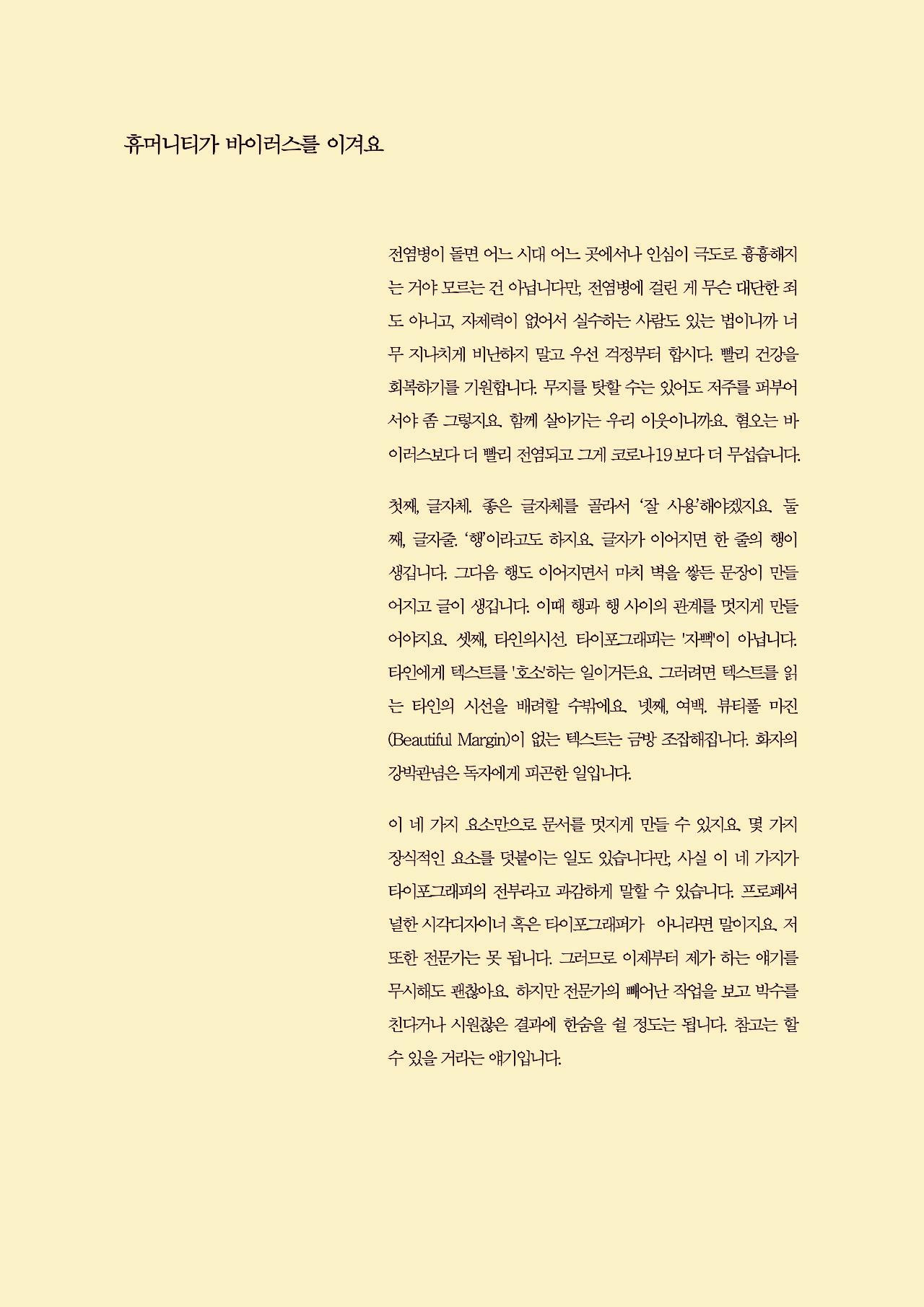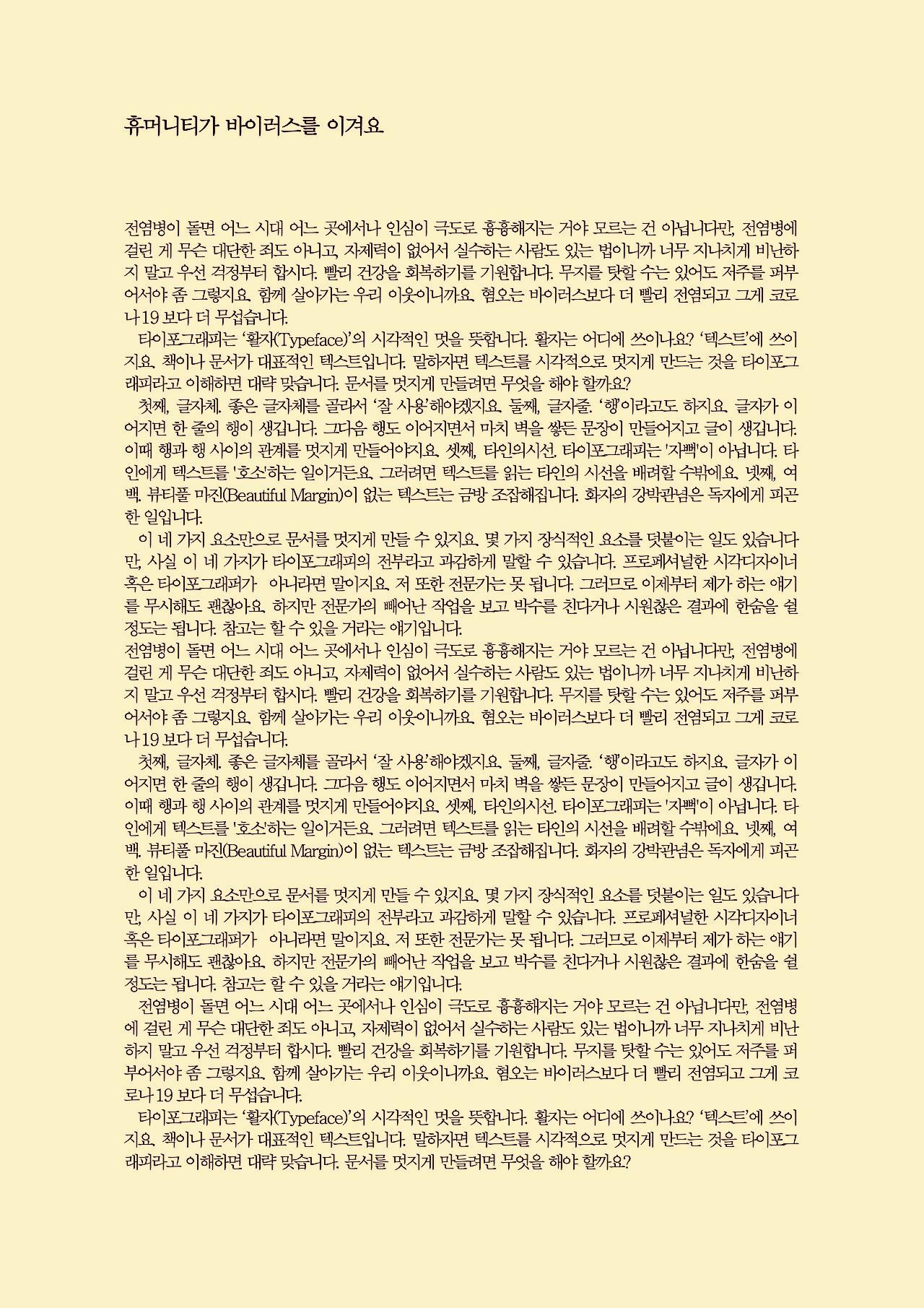 위 레이아웃 예시를 통해 제가 여백을 과감하게 사용했음을 알 수 있겠지요. 맞아요. 여백은 과감하게 사용하는 것이 좋습니다. 여백은 낭비가 아닙니다. 텍스트를 위한 투자이며, 독자의 쉼터입니다. 게다가 여백은 텍스트를 더 세련되게 만들어줍니다. 여백이 없으면, 글을 읽는 속도가 줄어들고, 어디까지 읽었는지 행을 놓치기 십상이며, 독자의 성취감도 감소합니다. 결국 읽기 싫어지는 것이지요.