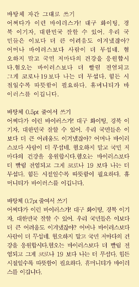 다음은 무료 서체 중 바탕체를 쓰는 용법을 예시합니다. 어떤 차이가 있나요? 본래 컴퓨터에 설치되어 있는 바탕체는 자간이 늘어져 있습니다. 적당히 쓸 수 있기는 하지만 멋지지 않은 서체이지요. 글의 분량이 많아질수록 서체의 못난 특징이 더 잘 드러납니다. 어쩐지 피곤하고 글을 읽기 싫어집니다. 신뢰도가 떨어지는 무료 서체입니다. 하지만 자간을 줄여주면 신기하게도 신뢰도가 향상되지요. 유료 서체와 비슷해져요. 바탕체는 자간을 줄여서 씁니다. 맑은고딕도 약간은 글자 간격을 좁혀 주는 것이 좋습니다. 해상도 때문에 글이 좀 깨졌습니다만, 차이를 한번 감상해 보시지요. (MS오피스 바탕체 기준입니다)