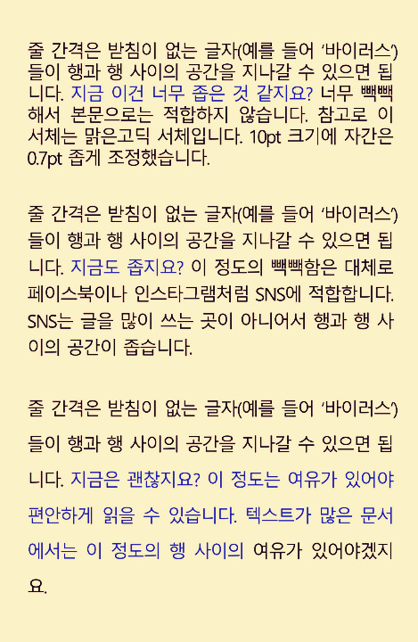 <본문>의 행과 행 사이의 간격은 받침이 없는 글자가 지나갈 수 있는 정도의 간격이라면 좋습니다. 영어 문장의 경우에는 모음이 지나갈 수 있는 정도의 간격이라면 적당하고요. 이걸 원칙으로 행 간격을 조정하면 대략 맞습니다. 이것은 어디까지나 텍스트 본문에 관합니다. 제목인 경우에는 행간이 좀 좁은 것이 좋습니다. 아래 예시를 비교해 보면 느낌이 올 것 같습니다.