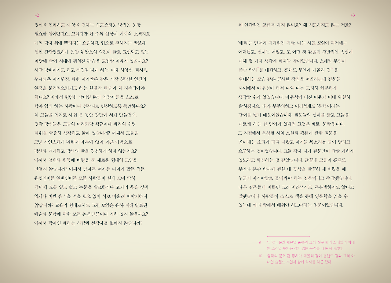 한글에 대한 타이포그래피의 역사는 짧아요. 백 년도 넘지 않습니다. 세종대왕 시절까지 거슬러 올라가고 싶은 사람도 있겠지요. 하지만 타이포그래피는 ‘텍스트’를 시각적으로 멋지게 만드는 일인데, 텍스트 자체가 그 시절과 지금이 다르잖아요. 일단 글자 자체가 ‘서로 사맛디 아니”했고, 한자가 더 중요했으며, 게다가 세로쓰기였잖아요.