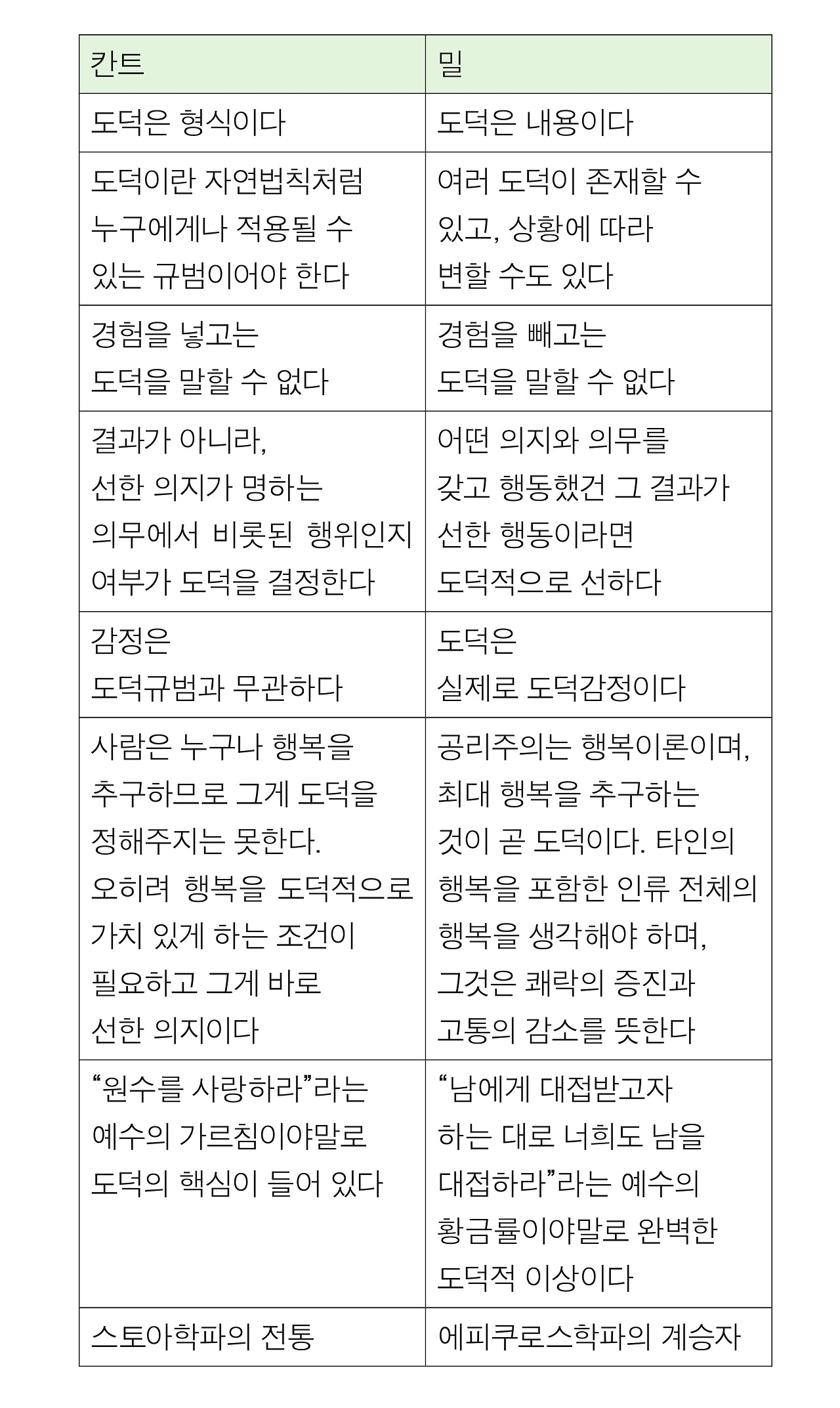 칸트철학과 밀이 말하는 공리주의를 간편하게 표로 정리해봤어요. 존 스튜어트 밀의 <공리주의> 한글 번역본인 <타인의 행복: 공리주의> 편집여담에 수록된 겁니다. 제가 만들었으니까 제가 사용해도 되겠지요.