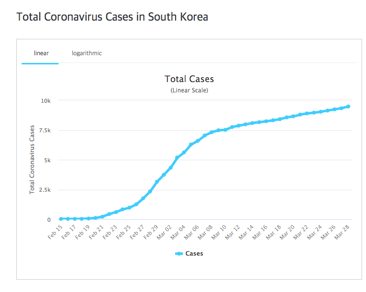 기울기의 변화가 남다릅니다. 2월 26일 처음으로 천 명(1,261명)이 되었으나, 32일이 지나도 아직 만 명에 이르지는 않았습니다. 다른 나라 사례를 살펴보면, 대략 10일이면 확진자 수가 천 단위에서 만 단위로 뛰어넘어가지만, 한국의 코로나바이러스는 그렇지 못하다는 거지요.