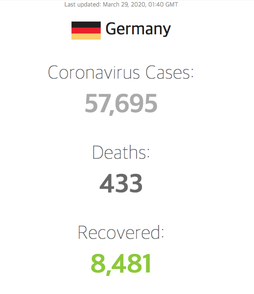 언론 보도에 따르면 독일의 의료시스템은 다른 유럽 국가보다 매우 양호하다고 알려져 있습니다. 상황은 어떨까요? 총 57,695명이 코로나19에 걸렸으며 그중 433명이 사망했습니다. 사망율은 0.75%입니다. 사망율이 이탈리아, 스페인, 프랑스에 비해 현저히 낮습니다.