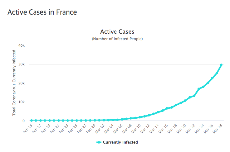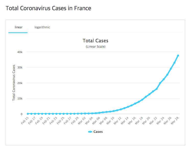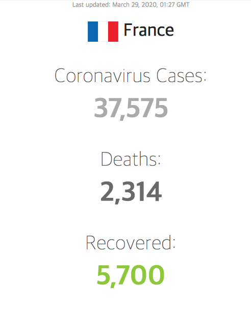 프랑스의 코로나 확진자 수는 37,575명, 이중 사망자는 2,314명입니다. 사망율은 6.16%입니다. 이웃한 이탈리아나 스페인에 비해 양호하지만, 상당히 위중한 상황입니다.