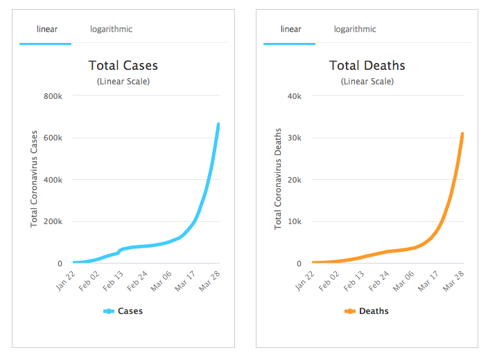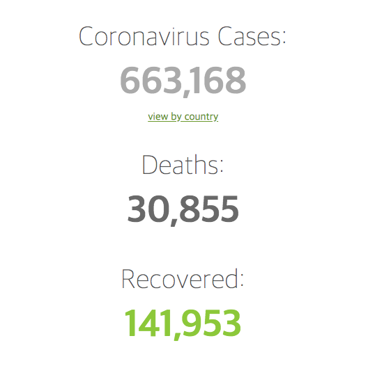 전세계 663,168 확진자 수에 30,855명이 사망했습니다. 사망율은 4.65%입니다.