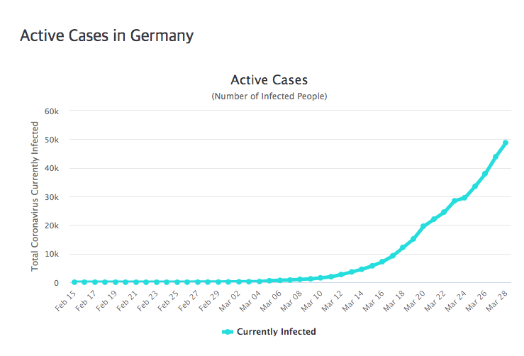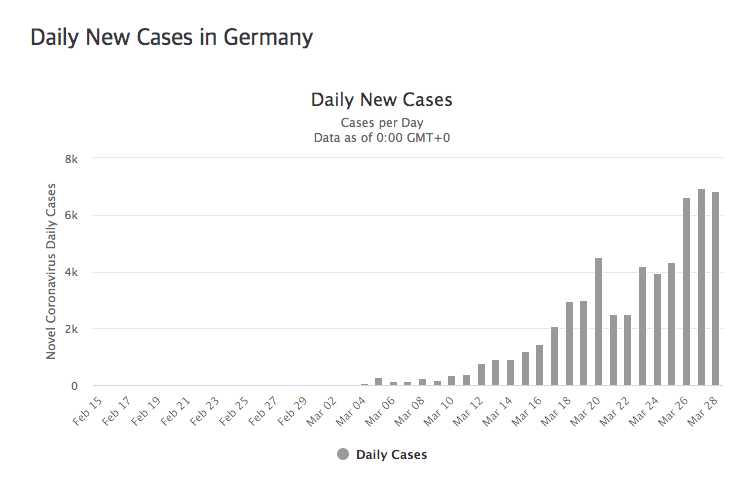 현재 독일에서는 매일 수천 명씩 신규 확진자가 발생하고 있습니다. 최근 3일은 6,000명 이상 신규확진자가 발생하고 있는데, 이는 이탈리아보다 많고, 프랑스보다 수천 명씩 더 많은 통계입니다. 위험하다는 얘기입니다. 3월 27일 신규확진자 수는 6,933명이었습니다.
