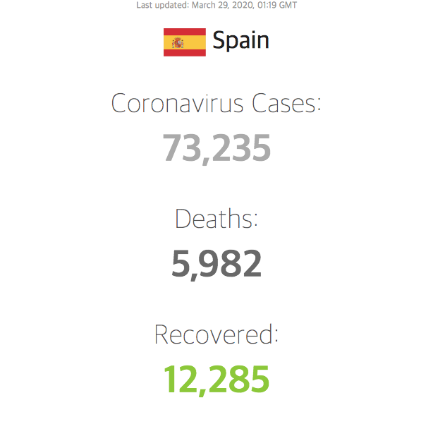 지금까지 스페인의 코로나19 확진자 수는 73,235명이며 이중 5,982명이 사망했으며, 사망율은 8.17%입니다.