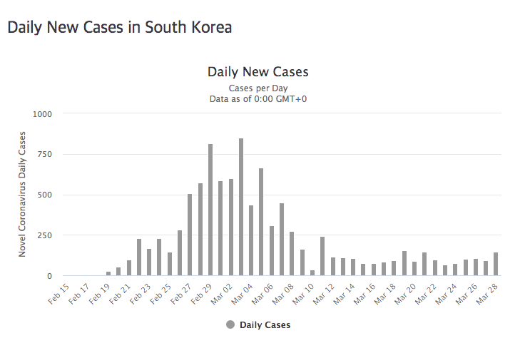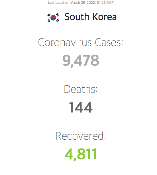 우리나라는 통계는? 저보다 이 글을 읽는 독자들이 훨씬 잘 아시겠지요. 3월 29일 0시 기준으로 9,478명의 확진자에 144명이 숨졌으며 코로나19의 치사율은 1.52%입니다. 독일보다는 높고 미국보다는 낮습니다. 한국 코로나19에 대한 현황에 주목해야 할 점은 이런 숫자가 아닙니다. 그 추세입니다.