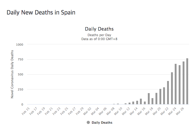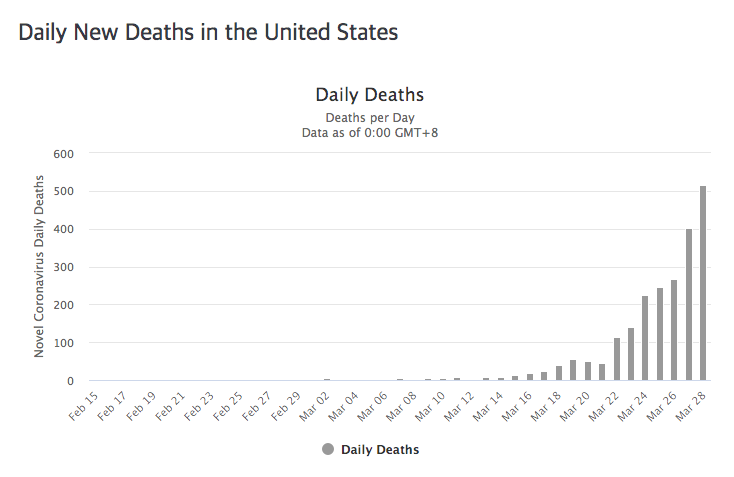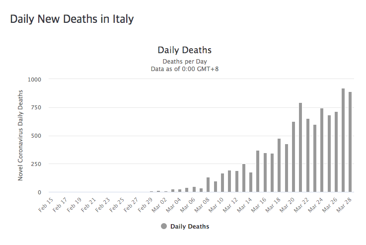 3월 하순에 진입하자 매일 수백 명씩 사망하고 있으며 그 숫자는 증가일로에 있습니다. 3월 28일에는 525명이 코로나19로 말미암아 사망했습니다.