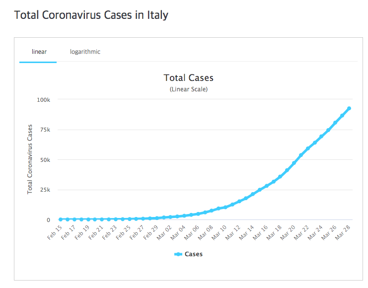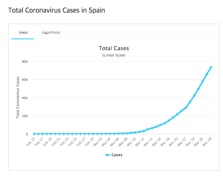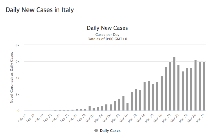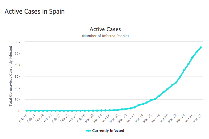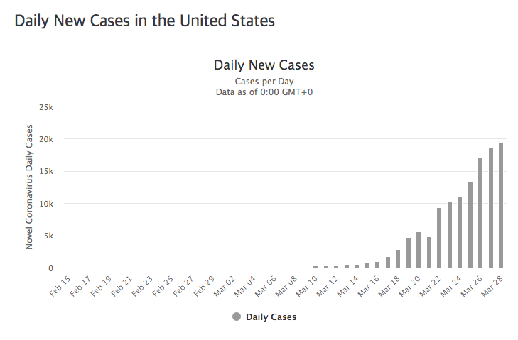 3월초까지는 괜찮았습니다. 그러다가 3월 중순부터 갑자기 늘어나더니만 하루에도 수천 명씩 확진자가 발생했습니다. 3월 하순부터는 일일 확진자 수가 만 명을 넘었습니다. 이런 추세를 보이는 나라는 현재 미국밖에 없습니다. 3월 28일 하루에만 19,452명이 코로나19에 감염되었습니다.