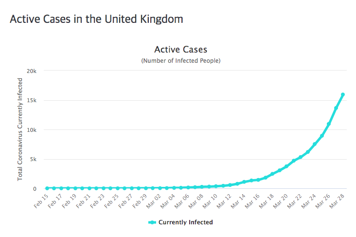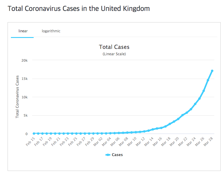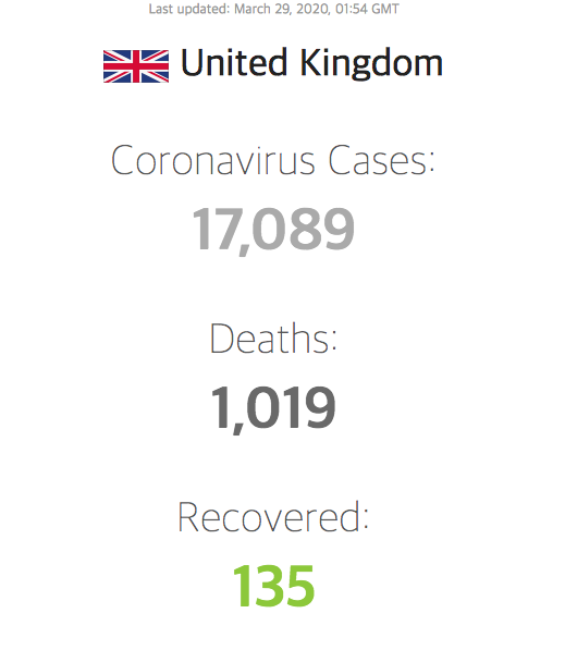 제가 듣기로는, 영국은 당초 코로나19를 완전히 차단하는 정책보다는 자연스럽게 감염자를 늘려서 항체 보유자를 늘림으로써 코로나19를 극복하려는, 다소 느슨한 정책으로 대응하려고 했다는데, 지금은 어떤가 모르겠습니다. 영국과 유럽대륙 사이에는 바다가 있습니다. 그러나 바다는 코로나19의 확산을 일주일 늦춰주었을 뿐입니다. 왕세자와 총리까지 바이러스에 감염된 상태입니다. 17,089명의 확진자에 1,019명이 사망했습니다. 바다 건너 프랑스의 절반 수준의 통계를 보여주지만 사망율은 거의 비슷한 5.96%입니다.