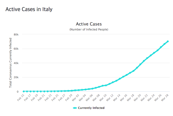 아래 그림은 총확진자에서 회복자를 뺀 숫자입니다. 이탈리아와 마찬가지로 감소추세가 없습니다.
