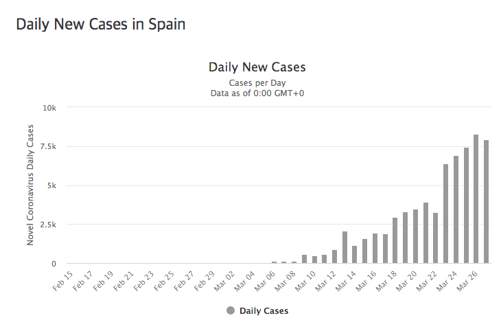 새로운 확진자 수는 3월 18일 경 2,943명에 이르렀고, 매일 수천 명씩 신규 확진자가 발생하고 있습니다. 최근에는 확진자 수가 3월 26일 8,271명을 기록했으며 매일 7,000명을 넘으면서 이탈리아보다 더 많은 확진자가 발생하고 있습니다. 매우 위험합니다.