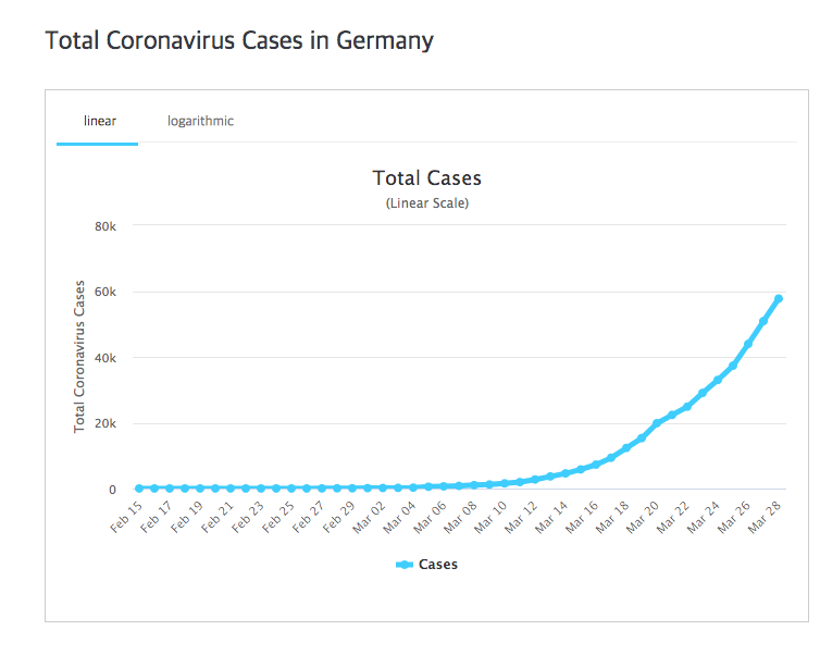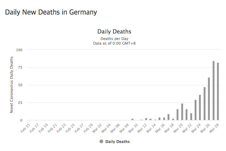 독일에서 유일하게 안도할 수 있는 것이 사망자 숫자입니다. 다른 나라에 비해 아주 낮습니다. 그래도 하루에 50명 이상 사망하고 있습니다. 3월 27일에는 84명, 3월 28일에는 82명이 사망했습니다. 아래에서 한국의 사망자 수와 비교하면 이것이 얼마나 많은 숫자인지 알 수 있습니다.