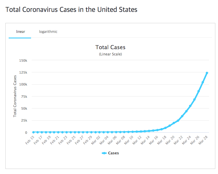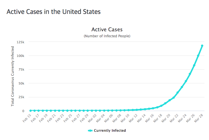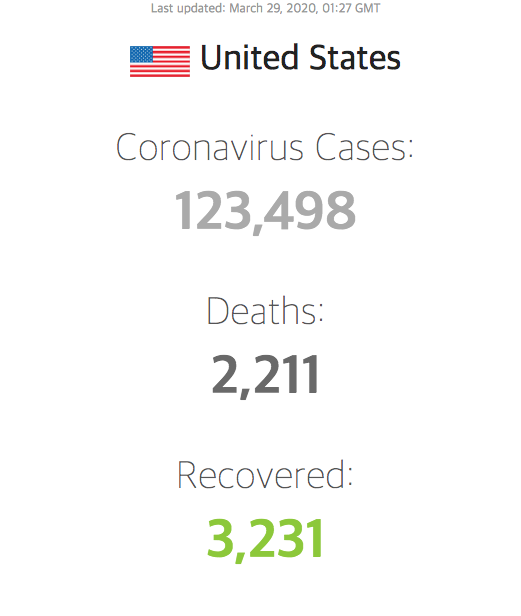 미국은 코로나19에 감염된 확진자가 세계에서 가장 많은 나라입니다. 최근 아주 걱정스러운 나라가 되었습니다. 총 확진자는 123,498명이며, 이중 2,211명이 사망했습니다. 사망율은 1.79%입니다.