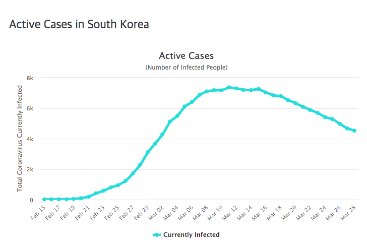 모든 나라 사람들이 원하는 가장 이상적인 그래프를 한국이 보여주고 있습니다. 3월 11일을 정점(7,362명)으로 확진자의 수가 줄어들고 있습니다. 확진자의 증가폭이 커지지 않기 때문이며, 완치자가 늘어나고 있기 때문입니다.