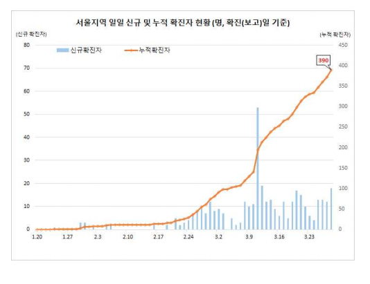 서울과 경기도의 코로나 바이러스의 확산 상황은 다음과 같습니다. 일일 확진자 수가 눈에 띄게 늘어나지 않습니다. 그렇다고 해서 대구처럼 감소하지도 않습니다. 위험위험하다는 생각이 드는군요. 한편으로는 안심하지만 한편으로는 걱정스럽습니다. 어디에선가 집단감염이 발생하거나 바이러스에 대한 경계를 늦추면 난리날 것 같은 분위기입니다.