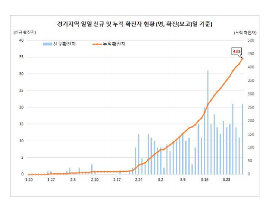매일 확진자수는 3월 11일 2,313명으로 이천 명을 넘은 후, 3월 21일에는 6,557명의 확진자가 발생하였으며 계속 수천 명의 신규 확진자가 매일 발생하고 있습니다.