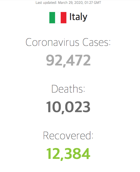 먼저 이탈리아입니다. 92,472명의 확진자 중 10,023명이 사망했습니다. 사망율은 10.84%입니다. 세계에서 가장 높습니다. 보도에 의해 전해지는 소식이 안타깝습니다.